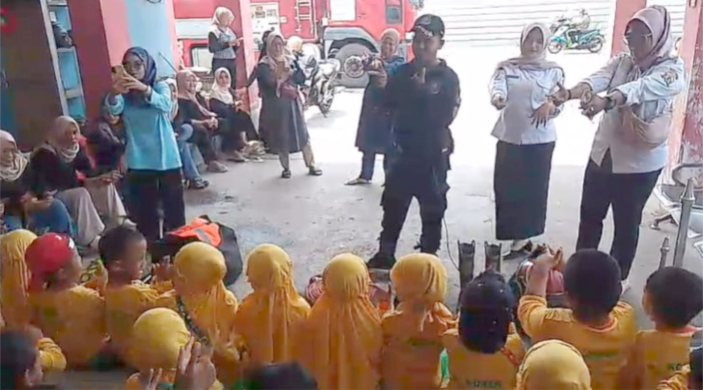 "Kami memperkenalkan peralatan dan kendaraan yang digunakan, dan konsepnya adalah bermain sambil berbagi ilmu. Kemudian, hujan buatan disemprotkan ke atas, dan anak-anak menikmati mandi hujan. Mereka juga diajak naik mobil pemadam kebakaran dan berkeliling kompleks kantor Pemadam Kebakaran. Setelah itu, mereka berfoto bersama guru, orang tua, dan petugas Pemadam Kebakaran," jelas Gilang.