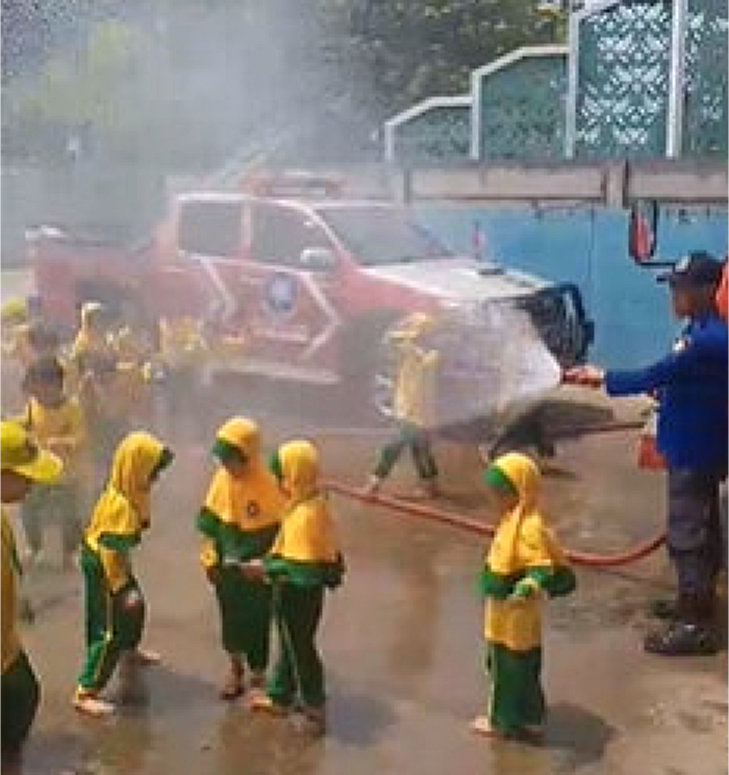 Salah satu kegiatan yang diikuti anak-anak dengan antusias adalah mengajari mereka cara memegang selang untuk menyemprotkan air saat memadamkan api. Kegembiraan mereka terlihat jelas ketika para petugas mengarahkan selang ke arah anak-anak dan merasakan semprotannya menciptakan semacam hujan buatan.